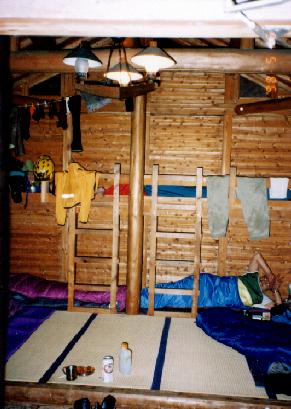 2段ベッドで上下4人収容でき、5畳の床。手前に広めの土間がある。 上にはランプがあり、明るく快適な雰囲気であった。 雨に濡れた衣類もこうして乾かせ、土間にも自転車など数台収納できる。 ひとしきり夜の宴会も終わり、シュラフに潜り込んで真に寝る前の様子。