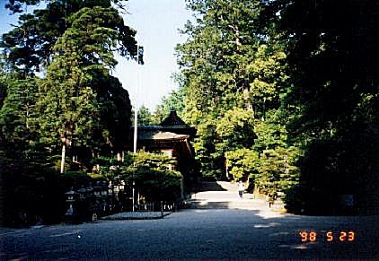 この写真手前の大鳥居をくぐると鶏が群れ、遊ぶ光景は古代の雰囲気が漂う。