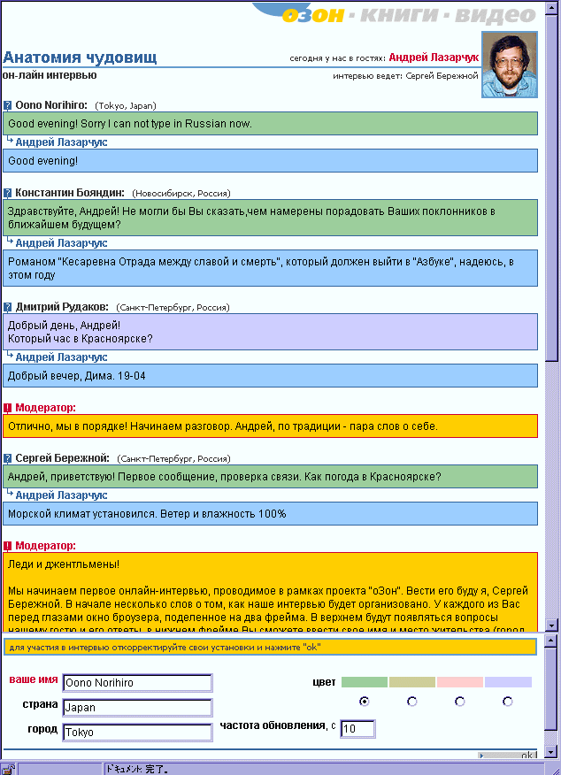 ロシアを代表するSF作家にしてターボリアリズムの推進者アンドレイ・ラザルチュークのオンライン・インタビューが4月30日午後8:00(日本時間)より2時間半にわたって開催されました。インタビューのログはロシア語テキストで1200行におよぶ長大なものなので翻訳・掲載はしまぜんが、興味のある方は大野まで請求してください。