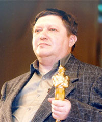 休憩の後は、文学の創出に直接携わる人々への賞になる。非芸術的作品(評論)賞はK・コロリョフ、短編はV・ポクロフスキイで、彼はテーマをより先鋭化させた「新しいファンタスティカ」の研究をしている。そして中編は、E・ルーキン。B・ビッレヴィチによる大統領のランチキ騒ぎに関するジョークに続き、自嘲賞の発表。毎回、「ストラーニク」では、恒例としてファンタスティカにかかわる自分たちのことを笑い飛ばしているのだ。今年の自嘲賞はA・ラザルチュクとM・ウスペンスキイ(右写真)による短編「黄色い潜水艦『モルドヴァのコムソモール員号』」となった。 最後には、長編賞の発表。全員が立ち上がり、ボリス・シテルンの名前を呼んだ。そしてボリスの早すぎる死の記憶に対し、一分間黙祷した。 その後は再び報道関係者との受け答えの時間。とはいっても、昨年のロバート・シェクリイのような目玉は無いので、記者が押し掛けるというようなことはなかった。 A・シドロヴィチが現れ、インタープレスコンが今年もまた開催されると言った。そしてN・ユータノフが、次の「ストラーニク」はいつもの時期にいつものやり方で、多数のゲストを呼び、面白い企画を盛りだくさんにすると約束した。 まあ、そういうことだ。