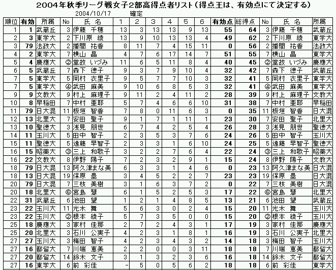 法政大はオープン参加のため、正式順位には同対戦成績を含めない。(かっこ)内数字が有効点 女子2部A 東学大 文教大 武蔵丘 北里大 法政大 昭薬大 数 勝-分-敗 得点 失点 差 点 1位 東学大 ******* 36 ○ 10 39 ○ 11 49 ○ 6 38 ○ 9 54 ○ 8 5 5- 0- 0