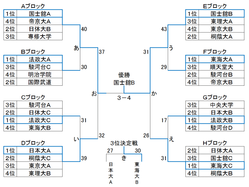 最終順位 優勝:国士舘大学B 準優勝:国士舘大学A 3位:東海大学B 4位:日本大学B