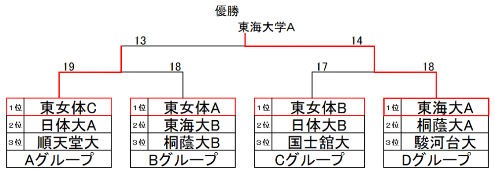 最終順位 優勝:東海大学A 準優勝:東京女子体育大学C 3位:東京女子体育大学A 4位:東京女子体育大学B