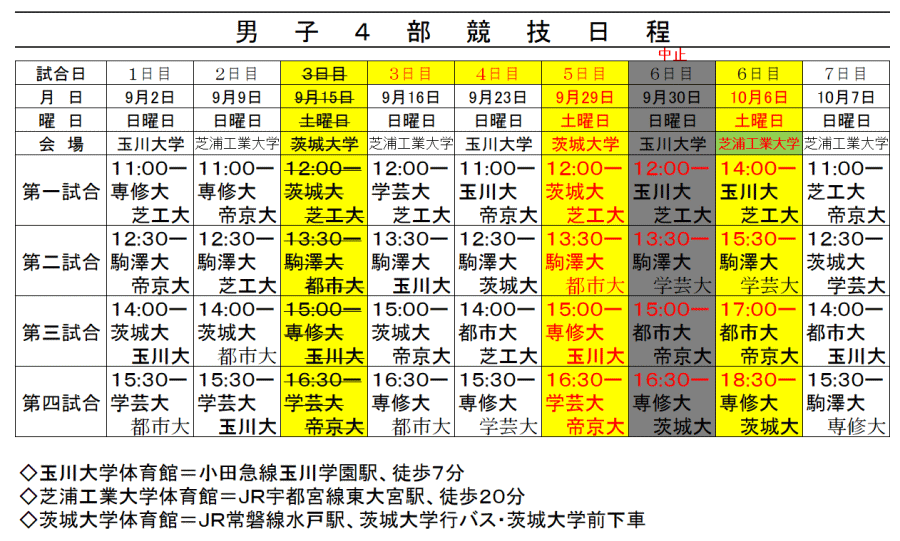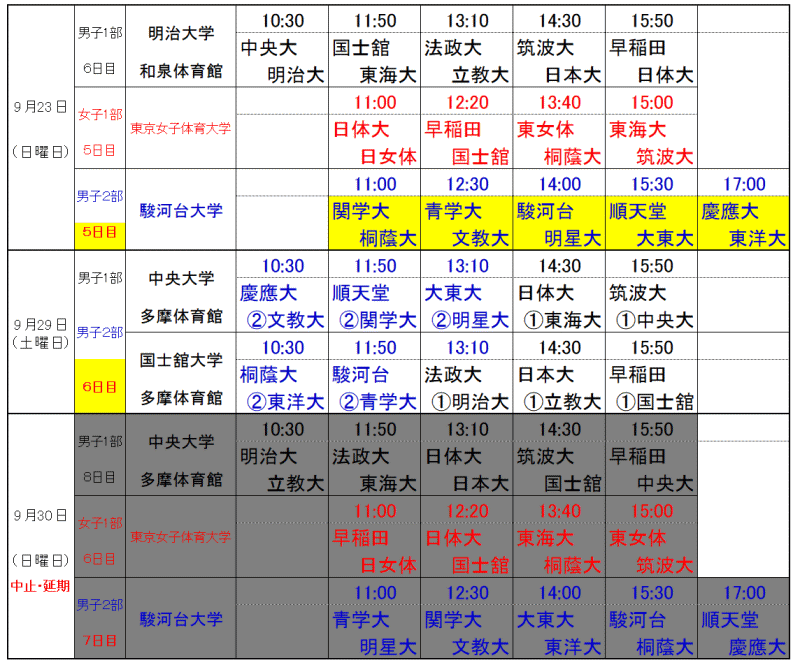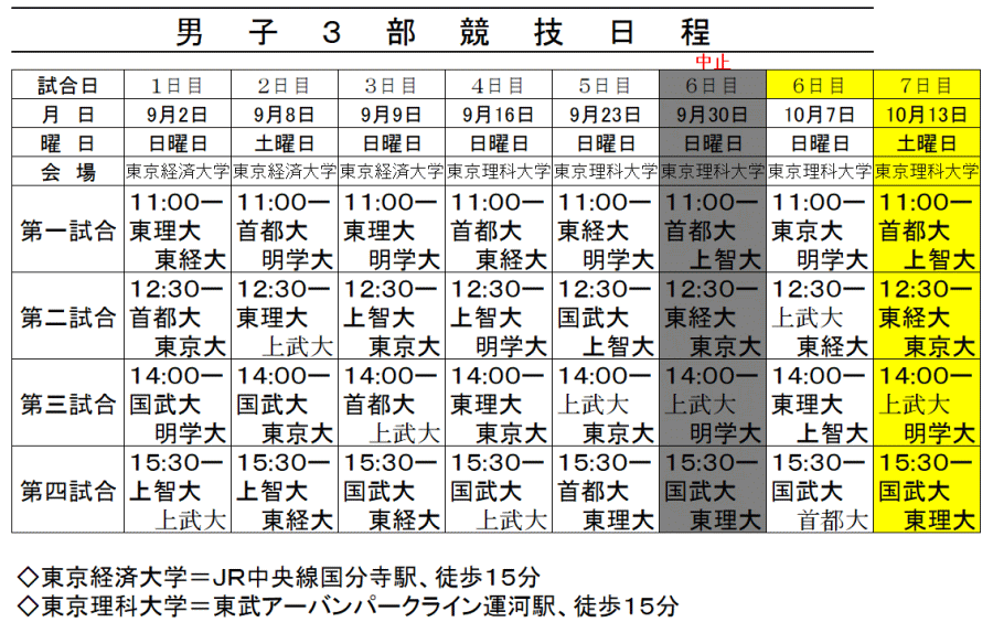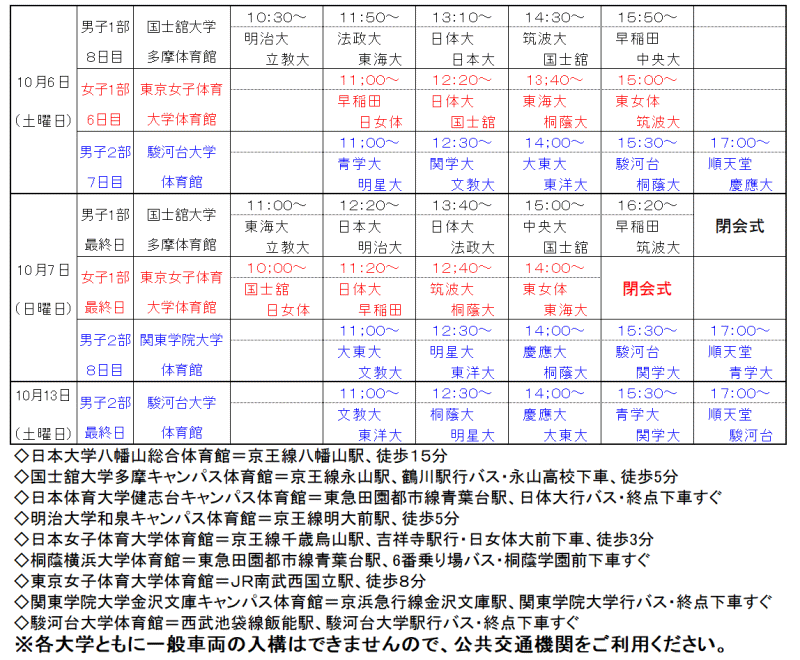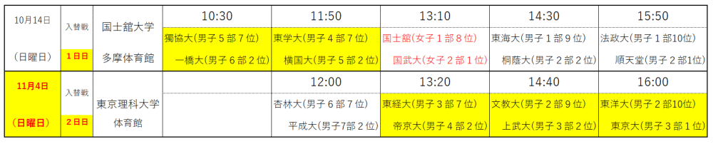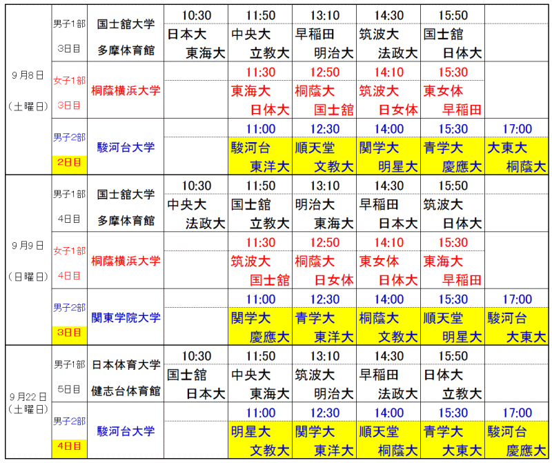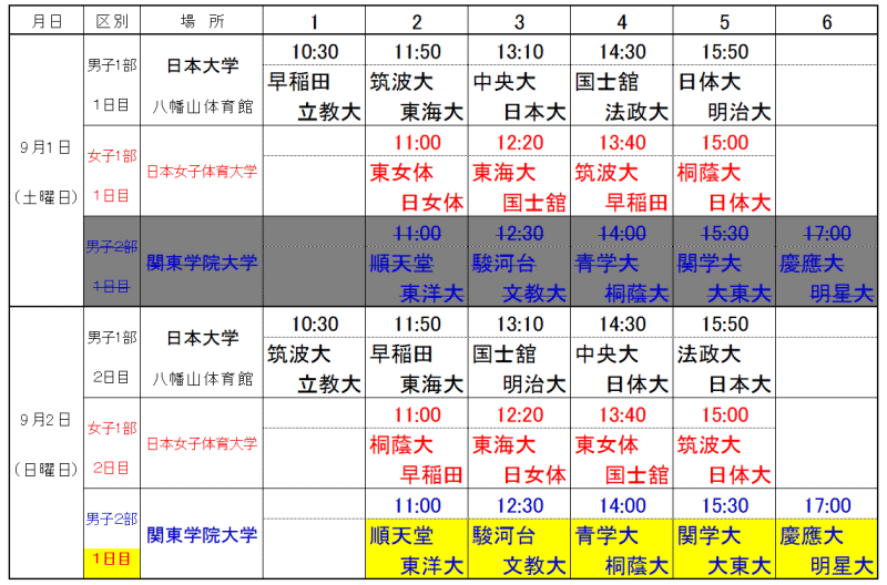 2018年関東学生ハンドボール連盟秋季リーグ戦日程表