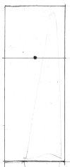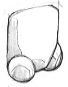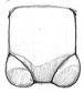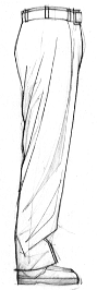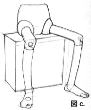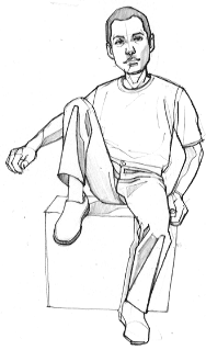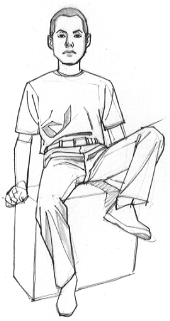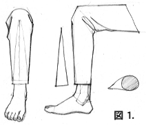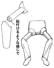 左の絵を見てみよう。これは宇宙人足に紙を貼付けてるだけなんだ。特にシワも入れてないんだけど、これだけでもなんだかズボンを履いてる人物にみえるでしょ。シワもいれてないのにね。そしてさらに足全体を鉛筆で真っ黒に塗りつぶして欲しいんだ。そしたら座っている人物の足全体のシルエットがうかびあがってくるでしょ。このシルエットを頭に刻んでおこうね。