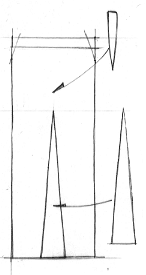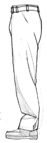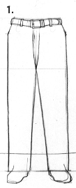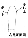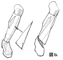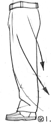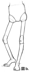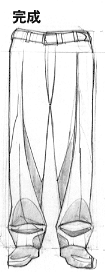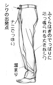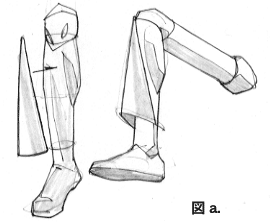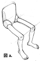 だぼだぼずぼんを履いて膝を大きく曲げて座ってみると下の絵図a.とb.のような足三角ができるのです。ズボンの生地の差はありますがこの足三角をくっつけるとらしく見えて有効です。