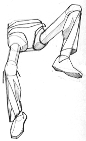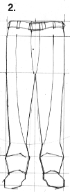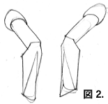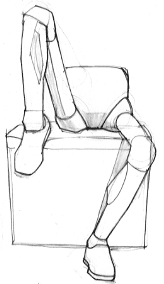 とにかく大腿部の筋肉を細く描くことを意識する。膝下には足三角を角度に会わせてくっつけて描こうね。そして少しだけ大腿部にお肉をつけてあげよう。 座っている人物を上から見たら大腿部はかなり細く見えるんだ。そしてカタカナのハのようになっているよ。この内側に向かう大腿の骨格の線を絶対残してね。このラインを無視して描くと足の個性が消えてただの棒になっちゃうよ。血の通った生きた足を描こうね。