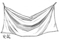 折り紙と布と重力線の関係は理解したよね。ここでは更に大きな布を描いてみよう。大きな重力線をしっかり把握して布の形の変化に対して対応していこう。前項では正方形の布だったよね、それが長方形になっただけなんだ、考え方を整理して効率良くえがこうね。
