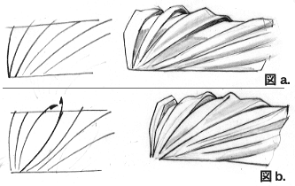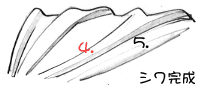 まず最初に2本の線を横に平行に5センチ間隔で12から15センぐらいの線を横にひく。そしたらの左の図を見てね 最初に引いた線を基に、。先にシワの流れを描くよで反るシワを一本だけ加えてみよう。上左の図で言ったら4.番のシワになるね。 そしたら左下の図を参考にシワをつくって描いてみよう。 初心者の人、大丈夫だよ、きっと上手く描けるから、安心しよう。 よく見て書き写してみて、ゆっくりゆっくりだよ。 4.番のシワがポイントね。