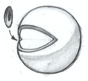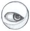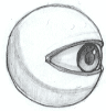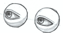まぶたや目の周りのしくみは球を包み込む皮の集まりなんだよ。だからここでは眼球にパタパタの術を張り合わして描く作戦で説明してくよ。球に目のラインを描き込む。ついでに目のタマも描いてみよう。上手く描けた?