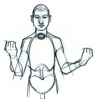 デッサン。挿し絵右と下1,2,3 腕を上げた時のハート(肋骨)の位置に注意して上腕を描く。最初はあまり「筋肉を意識しないで描く、棒でとらえてから筋肉をのせる」何度も言ってるよね。ここでも筋肉の動きとそして手がモノを握っている表情を観察しよう。一定の動作を描くと非常に筋肉の動きや形が頭に入りやすいよ。自分の腕の筋肉の動きをしっかり確認、上腕二頭筋を理解して自分のモノにしてしまおう。