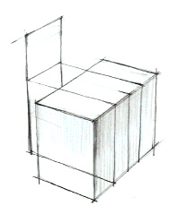 挿し絵2を見てみよう。肩幅と椅子の大きさを兼ねた基本線を入れてみる。挿し絵をよく見て描こうね。長方形を輪切りに3つに分けるような感じで基本線を入れてね。これでおおよその人物の大きさと椅子の位置が把握できたでしょ。