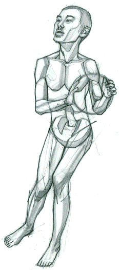 右の絵が完成したものだとすると、下の図は人物画が仕上がっていく経過です。人物を描くのにはそれぞれ自分が描き易い順番をつくっていこうって説明してきたよね。でも骨格から意識して描きすすめてもそれに当てはまらないポーズもでてくるよ。骨からきちんとデッサンして描いているのに、いま一つ上手く描けていない。こんなことって頻繁におこることなんだよ。そんなときは下の挿し絵をヒントにして組み合わせてみる。組み合わせもあなた次第。挿し絵の一部からでもいいのでヒントを自分で探してみようね。技法の混ぜ合わせは全て君の絵を描く経験の中で多くのひらめき、湧きあがってくるものなんだ。楽しく実践しようね。