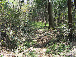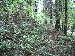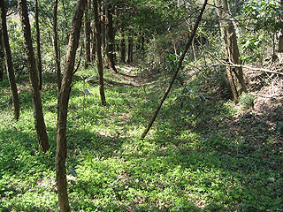 | 右の写真は金太郎富士見ラインに滝沢林道(小山へ下る道)が接続するところの少し北西側で「カザフキ」(カザフキの正確な位置は地元の方に聞いてもわかりませんでした)と呼ばれる付近のものです。舗装道路脇の林の中で、古道跡に似た掘割地形を見つけ撮影したものです。この地形はかなり古そうな道跡を予感させまが、途中で消えてしまっているので道跡であるのかは何ともいえません。ただこの掘割地形のすぐ近くに別の廃道が同じ方向に延びているのが確認できるのです。もしこの写真が古道跡であるとすれば、向方ルートか矢台ルートのどちらかではないかと考えます。 | ![]() |