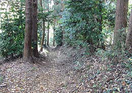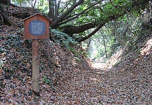 前のページの写真の切通しの坂を下ると、いったん舗装された道を横切ることになります。山道を抜けて視界のある明るい道がその先は狭いながらも舗装路として北へ続いています。道の右手には新しい住宅が何軒か建っています。舗装路を横切って少し行くと左に斜めに上る山道があります。その道は古道からは離れますが大日如来の石像のある頂きに上る道です。左の写真がその道です。 |