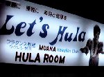 フラダンスとウクレレ教室の看板。Let's Hula. HULA ROOM. 僕もウクレレを持っています。