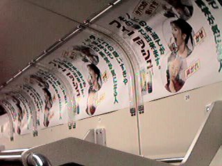 これが午後6時ごろの車内の様子。(普通ラッシュだぜ)少ないのは人じゃなくて、広告も少ない。同じ広告が4枚ならべて貼ってあったりします。