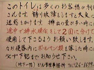 妙な貼り紙が近代的なオフィスビルのトイレをアパートの共同トイレにしてしまっていた。