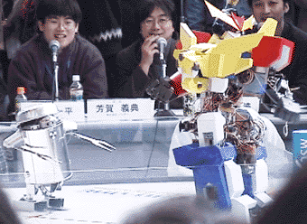 まず、決勝トーナメントとはいえ、緒戦は動けない(歩行できない)ものが多く、当初のルールだった「2歩歩かないと攻撃できない」をクリアできなくて、ギブアップというパターンが多かったこと。やはり、作ることにのみ焦点があたっていて、なかなか操縦技術とかメンテナンス性とかまで手が回らないのかなぁ。