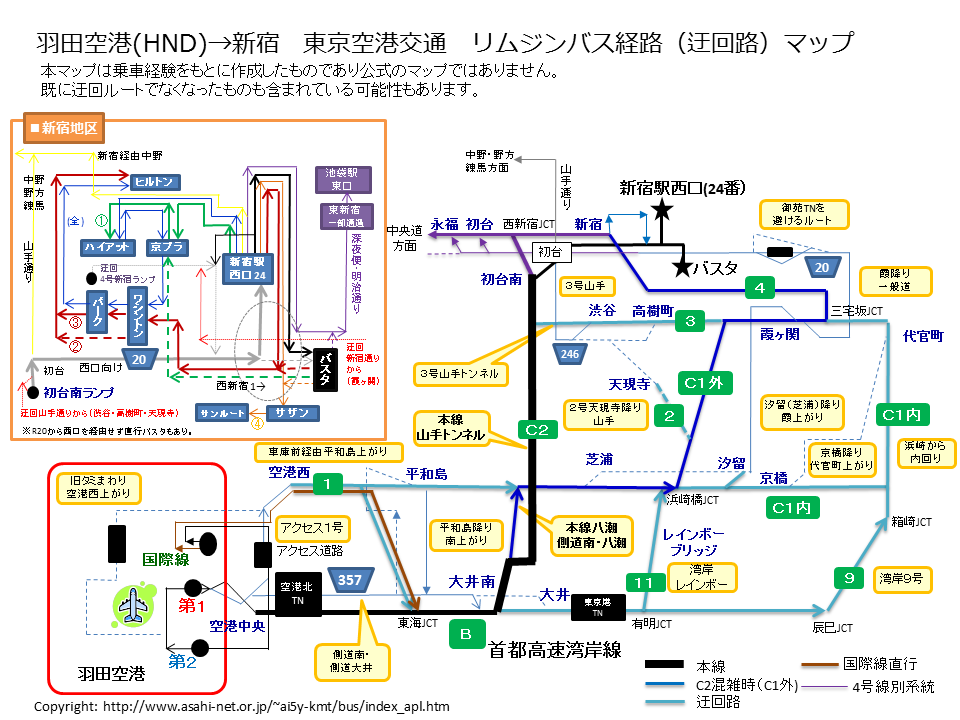 | 羽田空港から新宿の場合 中央環状線全通で大きく改善されたのは羽田発便になります。羽田空港第1ビルから25分弱で新宿駅まで到着可能です。 中央環状線全通以前は新宿発に比べると羽田発は大井南料金所、浜崎橋、4号線下りと動きの良くない渋滞が発生する区間も多く、朝夕は特に浜崎橋ネックの渋滞が続き、ひどいときは羽田空港から浜崎橋まで60分かかることもありました(平日17時台など)。 4号線下りは、以前は渋滞などありませんでしたが、中央環状線全通前の部分開通以降は、4号線下りに「合流地点」が発生することになり、これにより三宅坂からの全線渋滞が発生するようになりました。浜崎橋渋滞と4号線渋滞がかさなると、新宿まで90分以上かかることもありました。(多くは羽田発17時台前後) 渋滞がなければ、羽田発都心環状線経由でも30分程度で新宿駅へ到着します。遠回りになる湾岸〜9号線を経由するルートでも6km強遠回りになる程度なので、35〜40分もあれば新宿駅へ到着可能です。 2015年3月に中央環状線が全通してからは、この浜崎橋渋滞がきれいになくなり、定時性がアップ。 かわりに中央環状線の大井JCTを先頭にした渋滞が湾岸線に発生するようになりました。「合流」でなく「分岐」なのに渋滞が発生するのが不思議ですが、横羽線から中央環状に入るため東海JCTで湾岸線に合流してくる車両が多いからではないでしょうか? 大井JCT(料金所)渋滞は、ETC化以前は日常茶飯事で発生しており、本線(湾岸線)が渋滞しているときの側道(R357)への迂回が、約10年振りに適度に使われるようになりました。R357も環七との交差点にオーバーパスが完成したため、以前に比べると時間短縮になっています。 羽田空港から大井南までは空いていれば、本線で6分強。側道経由で10分程度の距離になります。 羽田空港発の場合、首都高速の夜間工事で渋滞することがありますが、夜は一般道も空いているため、迂回をしてもそれほど時間はかかりません。 羽田発新宿方面の迂回は新宿発に比べ渋滞ポイントが多いため豊富に用意されていましたが、2015年3月の中央環状線全通後は、中央環状線が混雑している場合にのみ使われることになるため、特に一般道への迂回は大幅に減りました。 中央環状線も初台南より先池袋方面では渋滞が発生することも多いのですが、初台南出口までスムーズに流れていることが多いのが現状です。 【羽田空港〜大井料金所】 2005年7月の首都高速回数券廃止によりETC化が進み渋滞ポイントが様変わりし、大井料金所渋滞が激減。 羽田を出て、「本線」か「側道357」か、それでもだめなら「旧タミまわり空港西」や「車庫前経由平和島」など羽田発の時点でも大きく4経路がありました。 第二ターミナル完成後の2006〜07年以降はかなりの確率で「本線」へ向かうようになりました。あわせて第二ターミナルと一緒に空港アクセス道路が完成し、空港西へ向かう際に羽田空港の南側をぐるっと回る必要がなくなり時間短縮になったので、この頃から「本線」「アクセス経由空港西」、それでもだめなら「側道357」という感じになり、以前はほぼ毎日迂回する時間があったR357へ向かうケースも激減しました。 第二ターミナル開業以前は本線へ入るのに羽田空港を周回し、空港中央まで4分かかりましたが、開業に合わせ直接本線へ入る道路が出来たのも側道が減った理由の一つです。 2015年3月の中央環状線開通以降は、大井料金所渋滞が復活しましたが、R357では2014年2月18日より大井環七立体も完成しており、環七信号待ち渋滞がなくなりR357の混雑時の流れも良くなったことから、「側道357」への経路変更も多少ではありますが復活するようになりました。 【浜崎橋】 浜崎橋渋滞は中央環状線全通前は毎日発生しており、発生する時間は一般道も混雑することが多いので渋滞の本線を走行していましたが、箱崎の渋滞如何によっては「湾岸9号」や一般道が空いていれば、「芝浦降り霞ヶ関上がり」という選択肢がありました。 浜崎橋より手前の1号線上での事故渋滞なら、浜崎橋への1号線からの流入が減るため、「湾岸レインボー」となります。 【都心環状線】 都心環状線内の渋滞があれば、内回り・外回りを使い分け、それでもだめなら「汐留降り霞が関上がり」となります。汐留降りは2004年から3年ほど禁止されて(禁止期間中は芝浦降り)いましたが、いつのまに復活していました。2004年以前は日中含め頻繁に汐留下りがありましたが、少なくとも2010年以降ではあまり発生しないので、都心部の交通量が減っていることがわかります。 このような場合、池袋など5号線方面のバスだと、汐留や京橋で降り一ツ橋を目指します。因みに京橋降り一ツ橋上がりは2010年以降も良くあります。 【4号線下りの渋滞】 4号線下り渋滞は、以前は夜の夜間工事の時が多かったのですが、中央環状線が2007年12月に4号線と繋がってからは合流渋滞が発生するようになりました。2010年3月までは「霞ヶ関降りのR20」か