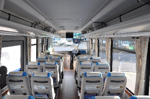 東京空港交通燃料電池バスの車内。前方から。 座席数が少ないのでこじんまりとした印象を受ける。 |