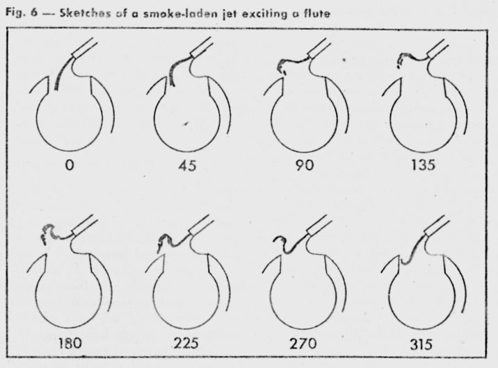 (論文の記述は専門的なのでなかなか判りにくいが、私の理解の範囲で説明しておく。位相0度ではたまたまジェットが内側に外れているが、これによってエッジの内側の空気は圧縮される。圧力の伝搬は音速であって、ジェットの流速に比べれば桁違いに速いのである。これにより、ジェットの内側の方の圧力が外側よりも高くなりジェットは全体として外側に押し出される。そうすると、押し出されたジェットの部分が流れてエッジに到達したときには今度はエッジの外側に当たり、外側の空気が圧縮され、内側の空気は吸い出されて圧力が下がる。その結果今度はジェットが内側に押し込まれる。これが180度での状況である。大まかにはジェットの長さ÷ジェットの速度程度の時間が経過している筈である。その後は上記とは逆方向の現象が起きて、元に戻る。以下これを繰り返す。このようにして発生するのがエッジトーンであるが、音波が拡がってエネルギーが散逸されるために綺麗な音にはならない。しかし、発生した圧力波が管体の境界で反射されて帰ってくるタイミングがエッジトーンの半周期と合えば、共鳴が起きる。(フルートの管は変位についての開放端なので、変位波は同じ向きで反射されるが、圧力がそこで大気圧に引き込まれることで、圧力波は逆向きして反射される。反射の位相については判りやすい実験がある。)つまり、共鳴条件はおよその処、ジェット出口からエッジまでの距離÷ジェットの流速≒音波の半周期 で与えられる。つまり、高い音を出すには「ジェット流速を速くする=口の中の圧力を上げる」という手段と「息の出口を歌口の対向エッジに近づける」という手段がある。ただし、後者は管の共鳴周波数を若干下げることにもなり、フルートという楽器の設計では、とりわけ第3オクターブ音において、そのことが考慮されていて、管の共鳴周波数が高めに設定されている。息の速度やエッジまでの距離という共鳴条件が少しだけ外れた場合には、共鳴周波数がエッジトーンの周波数に引きずられて、音程が少しだけずれる。これを耳で聴きながら微調整するのが奏者の重要な技術項目である。)