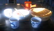 深大寺そばである。そばを1枚食べて帰ろうと決意する。看板に注意しながら南下すると、深大寺が近くなる。その途端、三鷹の住宅地から、田舎の観光地へとスリップする。狭い道の両側に森があり、大きな駐車場を持った観光地独特の匂いがする蕎麦屋がずらりと並ぶ。さらに近づくとみやげ物屋や喫茶店が並ぶ。左手に深大寺が見える。参道の両側にはこれまたお約束の蕎麦屋が並びたつ。赤い布を敷いたベンチがありそこで蕎麦を食すらしい。自転車を止め、山門をくぐる。この山門がまた素晴らしい。茅葺きの非常に古いものである。寺の敷地は広く、後ろに小さな山がそびえている。寺の立地には申し分ない。しばらく散策する。東京の有名な神社仏閣といえば金をかけたきらびやかな仏殿やらなにやらそういった豪奢さが鼻につくのだが、深大寺は違う。そこかしこに文化財に指定されていぢれないからかどうかしらないが、茅葺きの建築があり、本堂もそれなりに古めかしく、信州などに多くある適度に有名で適度にマイナーな観光地寺と同じ空気を持っているのだ。寺の回りにはこれまた茶屋蕎麦屋土産物屋が軒を連ねる。そこからひとつを選ぶ。「くずきり」があるというひとことに惹かれたためだ。