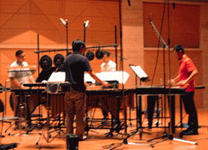 こちらは「ふるえる月」の録音風景。「パーカッション・ミュージアム」の若手気鋭の皆さん。左から小林巨明さん、西久保友広さん、横田大司さん、村居勲さん。幻想的で美しい演奏が録れました!楽譜はJFCから出ています。