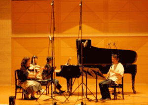 「ねじれていく風景」の録音風景。クラリネット・武田忠善さん、バイオリン・瀬川光子さん、ピアノ・柴田美穂さんという錚々たる顔ぶれ。エキサイティングな演奏が録れました!楽譜も音楽之友社から出版予定です。