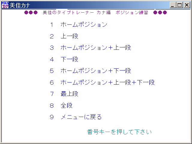 美佳のタイプトレーナ仮名編ポジション練習メニュー画面