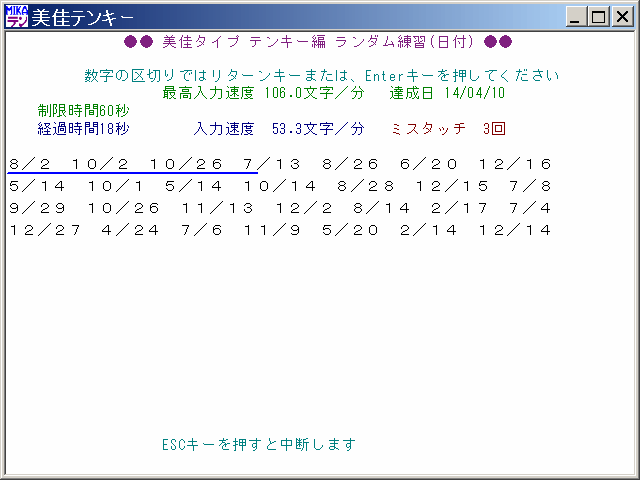 美佳のタイプトレーナテンキー編ランダム練習(日付)画面
