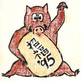 亥年です。なんとか猪に見えますよね。刷った状態の物が手元に1枚しか無かったのでこれを取り込んだのですが、これは刷りに失敗してるヤツですね。刷っているときに版木と紙が動いてしまい、絵の具が擦れたのでしょう。