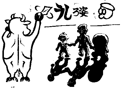 丑年です。前年に亡くなった藤子・F・不二雄先生への追悼の意味を込めています。後ろ姿はF先生を挟んでのび太とドラえもんです。地平線の上には手塚先生の顔をした太陽が浮かんでいて、この太陽は朝日ではなく夕陽のつもり。つまりF先生は「西」に向かっているわけです。これは手塚先生がいるところもF先生が向かっているところも「西方極楽」である・・・ということを表現しています。奥が深いですね。このドラとのび太って著作権に引っかかるかな。