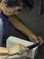 ハカマができたら、次は刃の研ぎ。おやじさんは天然砥石で刃を念入りに研ぐ。刃の研ぎは難しい。刃はただ鋭ければよいというものではない。ものを切るとき、先ず刃先が当たって切れたあとは刃が奥に食い込んで行くわけだが、食い込むにつれ切る対象を押し開く厚さが要る。かといって、そのままV字型に厚いのでは、切ったものとの摩擦で、切り口がまとわりついて奥深く刃が入っていかない。