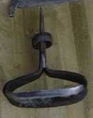 もとの方(柄に入る方:中子)をたがねで割って、指が刃先に流れないようにするストッパーを作る。このストッパーは金槌で打って中子から直角に曲げていくのだ。これはおやじさんのアイデアだ、そんな刃物は何処でも見たことがないぞ。 技術がないと出来ないワザだ (小山氏曰く:鍛冶屋なら誰でも出来るヨ)。結局、安来鋼入りの、ちょっとした金槌代わりにも使えそうなご立派なストッパー(指止め)が出来てしまった。