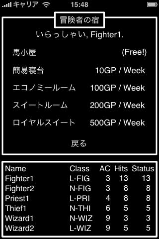 無事に城に帰り着いたようです。まずは宿屋で休息を取りましょう。宿屋にはいろんな部屋の種類があります。有料の部屋に泊まると、けがが徐々に回復します。馬小屋は無料ですが、けがは回復しません。魔力は回復するので、HEALの呪文を使い尽くしたら馬小屋に泊まって、迷宮の中でHEALをかけて治療するとお金がかからなくて済みます。