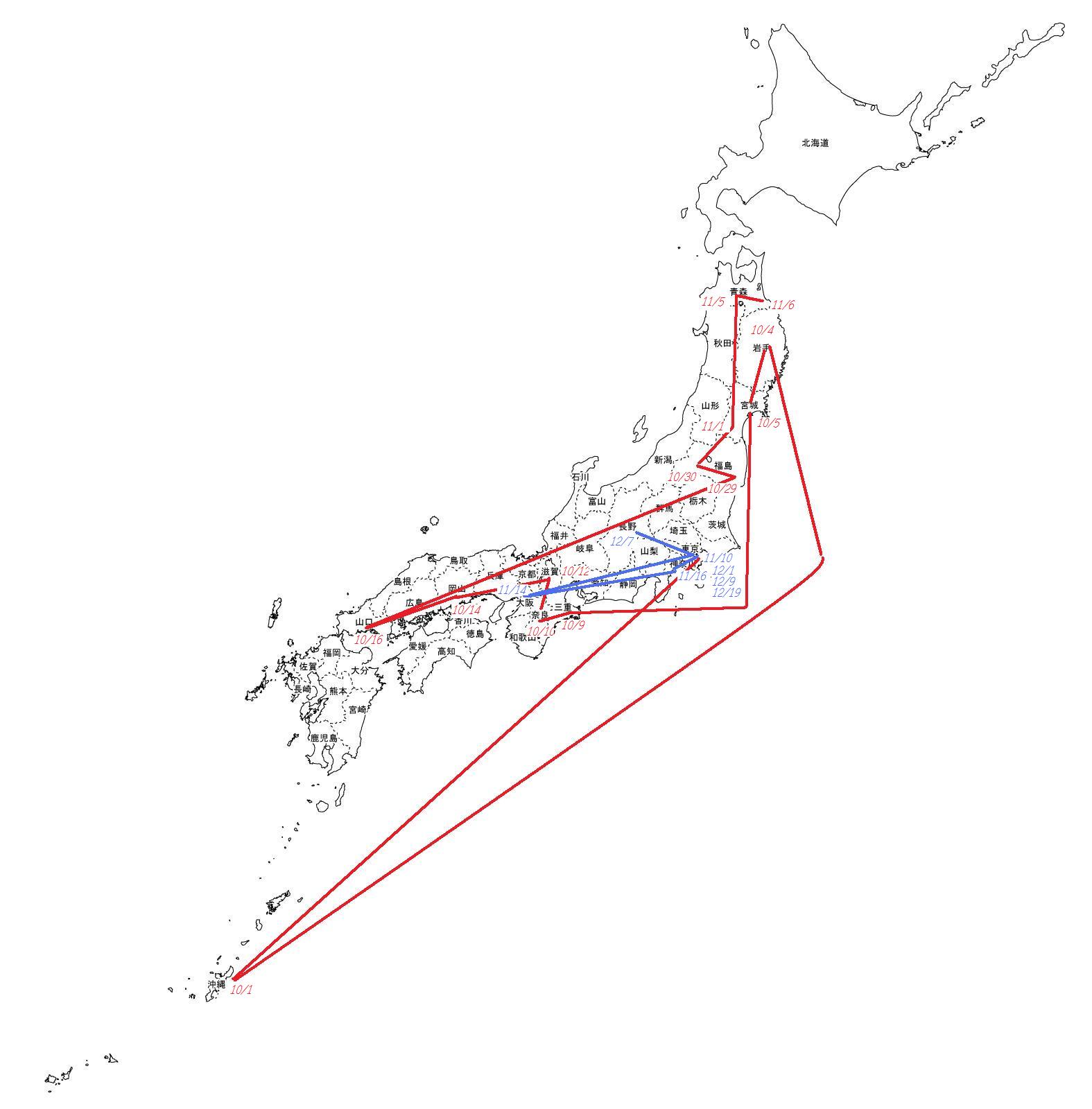 出演者は東京を起点に各地に移動、機材車とスタッフの移動の2つの動線なのでしょうか。