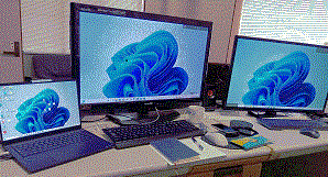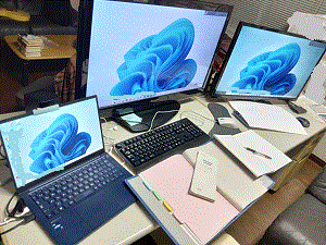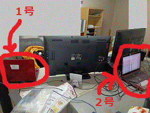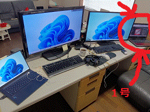 - その並べた事務机の上に、会社から貸与されているノートPC、そしてそのノートPCで表示する画面を拡張するため、
