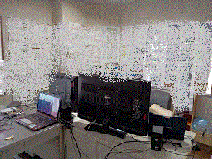 - イザっという時に直ぐに確認出来るようキング・ファイル(ドッチ・ファイル)に綴じていない巻物の紙、B紙などを全てではないですが壁一面に貼り付けました。