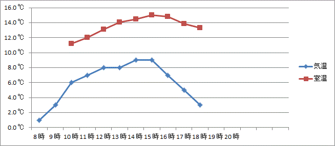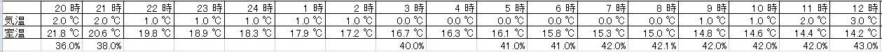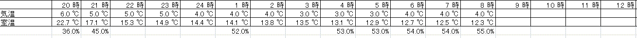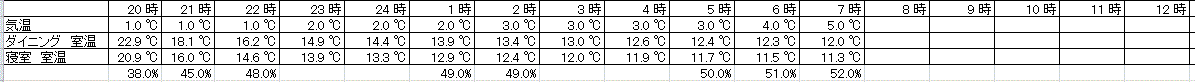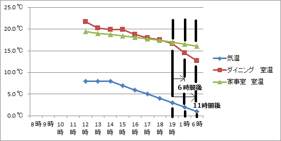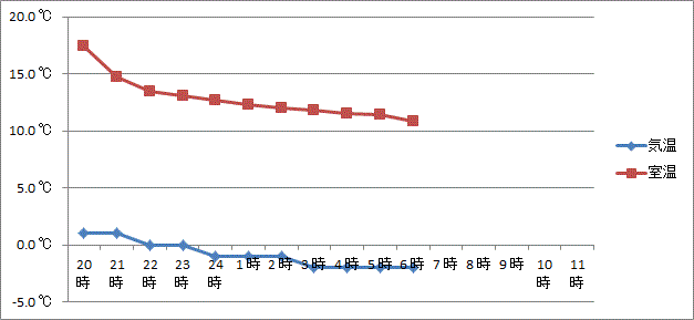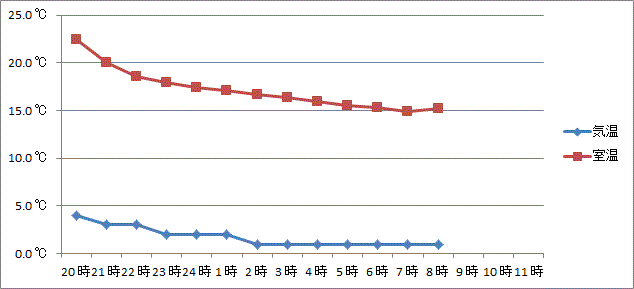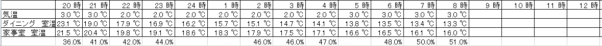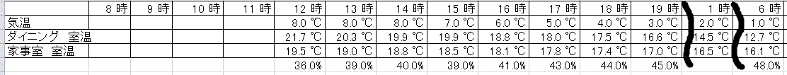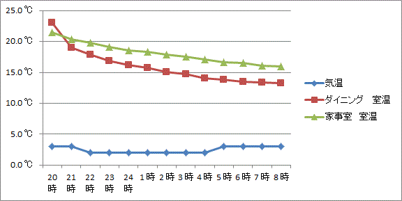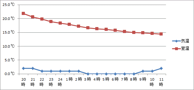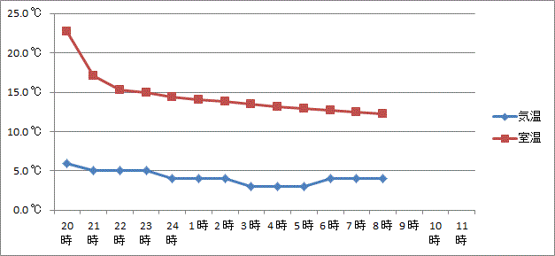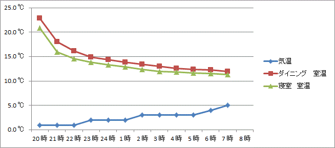 前回、20時から21時の温度の低下が異様に感じたのですが、改めて観察し、これが暖房器具の効果だと思いました。