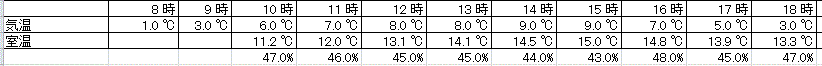 2024年1月11日(木)9時、昨夜から暖房を使用していなかったLDKのダイニングに位置するテーブルの上に温度計を置き、10時から18時まで室温がどのように変化するかを記録してみました。
