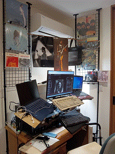 そして学習机に固定したデュアル・モニターアームにPC群を配置します。