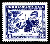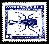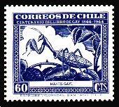 1948年にチリで発行された、チリの動物と植物とに関するゲイの著書出版100年記念切手25種の中に、昆虫3種が描かれています。カストニアガ、チリータカバクワガタ、オオカマキリです。単色刷で、同じ図案のものが3色あり、60¢は青、2$は緑、3$は赤で印刷されています。