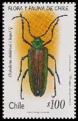 1995年にサボテンと昆虫の切手8種を描いた小型シートが発行されました(サボテン図案の4種と昆虫図案の4種)。有名なチリータカバクワガタ、大型のカミングオオウスバカミキリなどが描かれています。