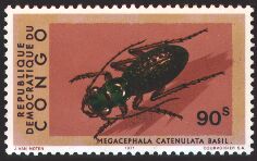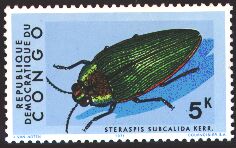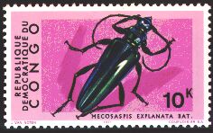 1971年にコンゴ民主共和国から素晴らしい甲虫切手10種が発行されました。1kのニジイロカナブン、2kのコンゴベニカミキリ、30kのアミメゴライアスオオツノコガネなどエチオピア区特産の甲虫が描かれており、甲虫の良い選定がされています。色彩が鮮やかでお気に入りの一つです。