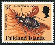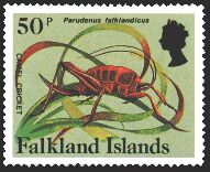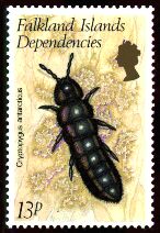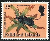 フォークランド諸島の昆虫切手フォークランド諸島は、南米アルゼンチン南端部の東方海上500km、南西大西洋上にあるイギリス領の諸島。1833年からイギリスが実効支配し続け現在に至る。諸島の領有を主張するアルゼンチンとイギリスとの間で、1982年にフォークランド紛争が勃発しました。東フォークランド島と西フォークランド島の2つの大きな島と776の小さな島から成り、諸島の総面積は12,173平方キロで、日本の長野県と同じぐらいです。東フォークランド島と西フォークランド島にはそれぞれ山脈があり、島の殆どが不毛な荒地ですが、東フォークランド島の平坦な土地は羊の牧草地になっています。