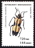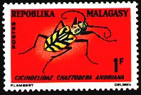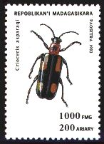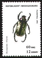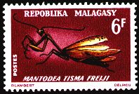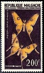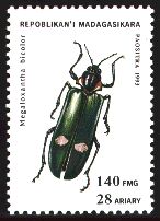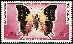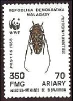 マダガスカルの昆虫切手マダガスカルはアフリカ大陸から離れた島国であることから、猿などの哺乳類をはじめ動物の生態系に特異なものが多く特産の昆虫も多く見られます。