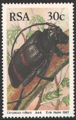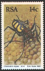 この南アフリカ共和国から1987年に甲虫切手4種が発行されました。甲虫が大きく生態的に描かれています。