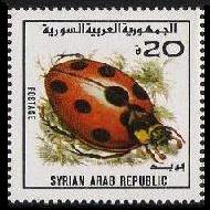 シリア・アラブ共和国の昆虫切手中東戦争で度々戦場となったシリアは、古代から通商・文化の東西交流の要衝として栄え、7世紀以降アラブ人によりイスラム化が図られ、16世紀からはオスマン・トルコに支配され、第一次大戦後はフランスの委任統治下に置かれました。独立は1946年ですが、58年にはエジプトとアラブ連合共和国を結成、それを解消して現在のシリア・アラブ共和国となったのは1961年のことです。独立後はイスラエルとの対立の歴史で、67年の第3次中東戦争では、ゴラン高原をイスラエルに奪われました。1971年に現アサド大統領が誕生し、イスラエルと逸早く対話に乗り出したエジプトと一時的に断交するなど、アラブ最強硬派路線を執って来ました。旧ソ連崩壊以降は、米大統領を招くなど外交姿勢に変化をみせています。