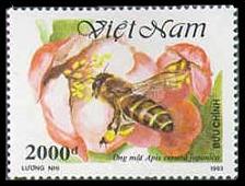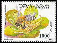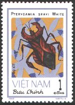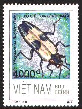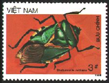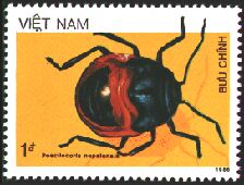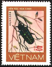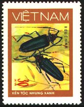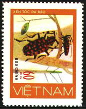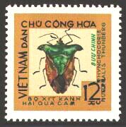 その後、南・北ベトナムが統一されベトナムが誕生、そのベトナムから1977年にカミキリムシを描いた甲虫切手8種が発行されました。さらに、1982年にカメムシを描いた切手8種が発行されました。8種類のすべてがカメムシで統一された美しく珍しい切手です。1986年にも昆虫切手8種が発行されました。1993年には、各種のミツバチを描いた切手6種が発行されました。その後、1994年、1996年に甲虫切手が各々4種、6種発行されました。